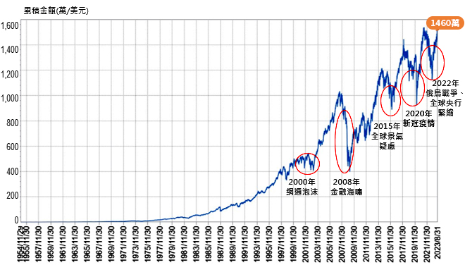 從下表可以看到,無論市場如何震盪,基金走勢長期保持向上,每一波的拉回續後都能再次走高。自1954年成立以來進場投資一萬美元,至今累積金額高達1,460萬美元。