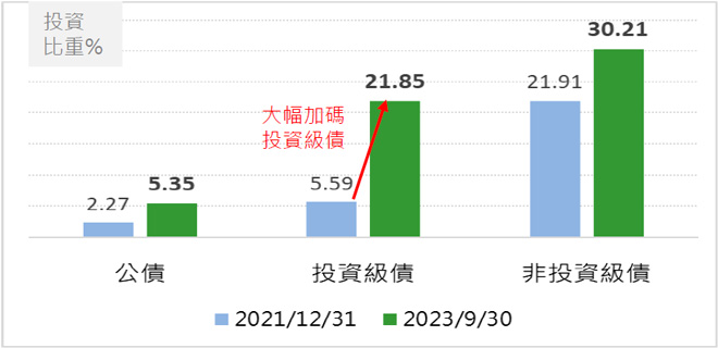 隨各類債券殖利率攀升,基金拉高債券比重,平均持債到期殖利率已升至近8%左右,大幅加碼投資級債,也使整體債信品質提升。