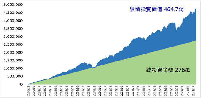 自2000月1月每月投入台幣1萬元,到2022年底的累積成果