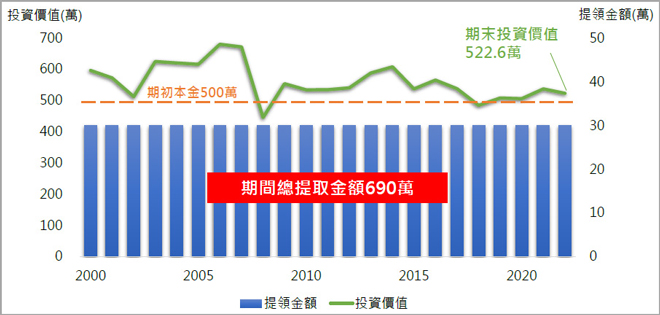 以下是本基金(穩月收)在過去23年來如何為協助投資人累積資產,及透過該資產構建未來退休時提領需求的試算結果。